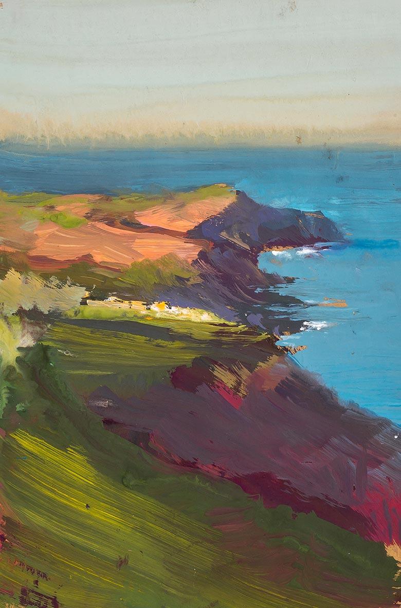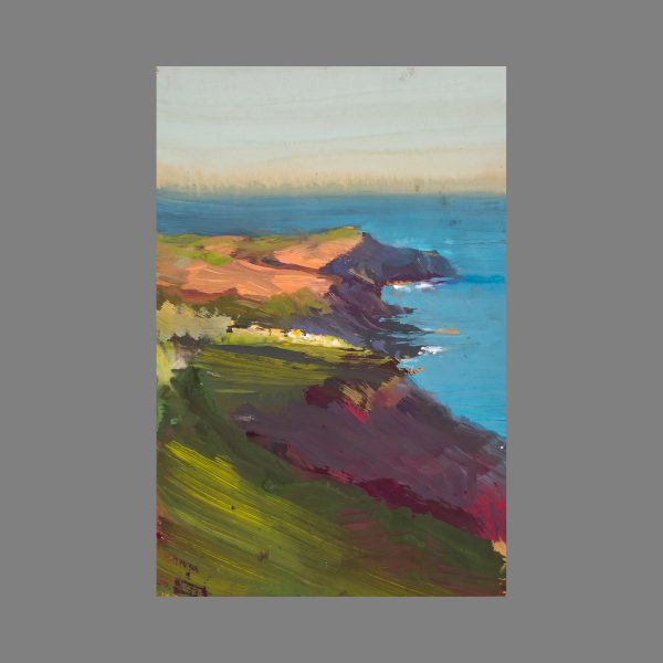 Excited to get started on my daily painting journey, I began by capturing the first light of the day on this fresh November morning. The early morning is one of my favourite times of day to paint, as the low sun casts a warm light over the landscape and intensifies the shadows. I painted this scene with gouache, my favourite medium for achieving vibrant colour, allowing me to capture the intense purples and pinks of the heather. This stunning stretch of coast is just five minutes walk from my house on the South West Coast Path, a walking route stretching 630 miles with so many spectacular views for painting. I expect that I will revisit this spot several times over the next year. This precious view is found between Ilfracombe and Lee, with Wales to the North and Lundy Island further West. There have been some landslides here recently, so it was a precarious place for me to paint - but well worth it!