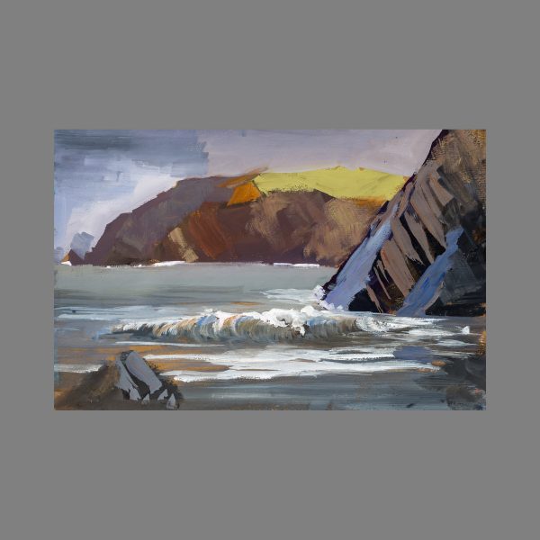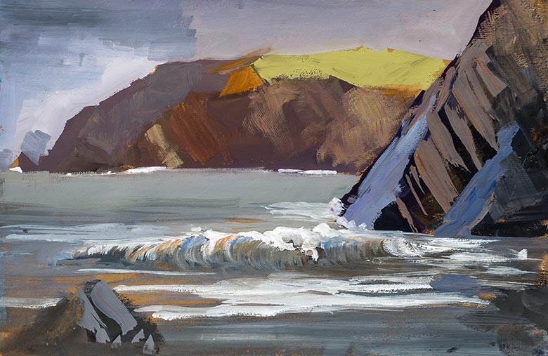 Lee Bay looking towards Ilfracombe, painted with a rich earthy palette. I finished the piece with bright white highlights to form the foaming waves rolling towards the shore.