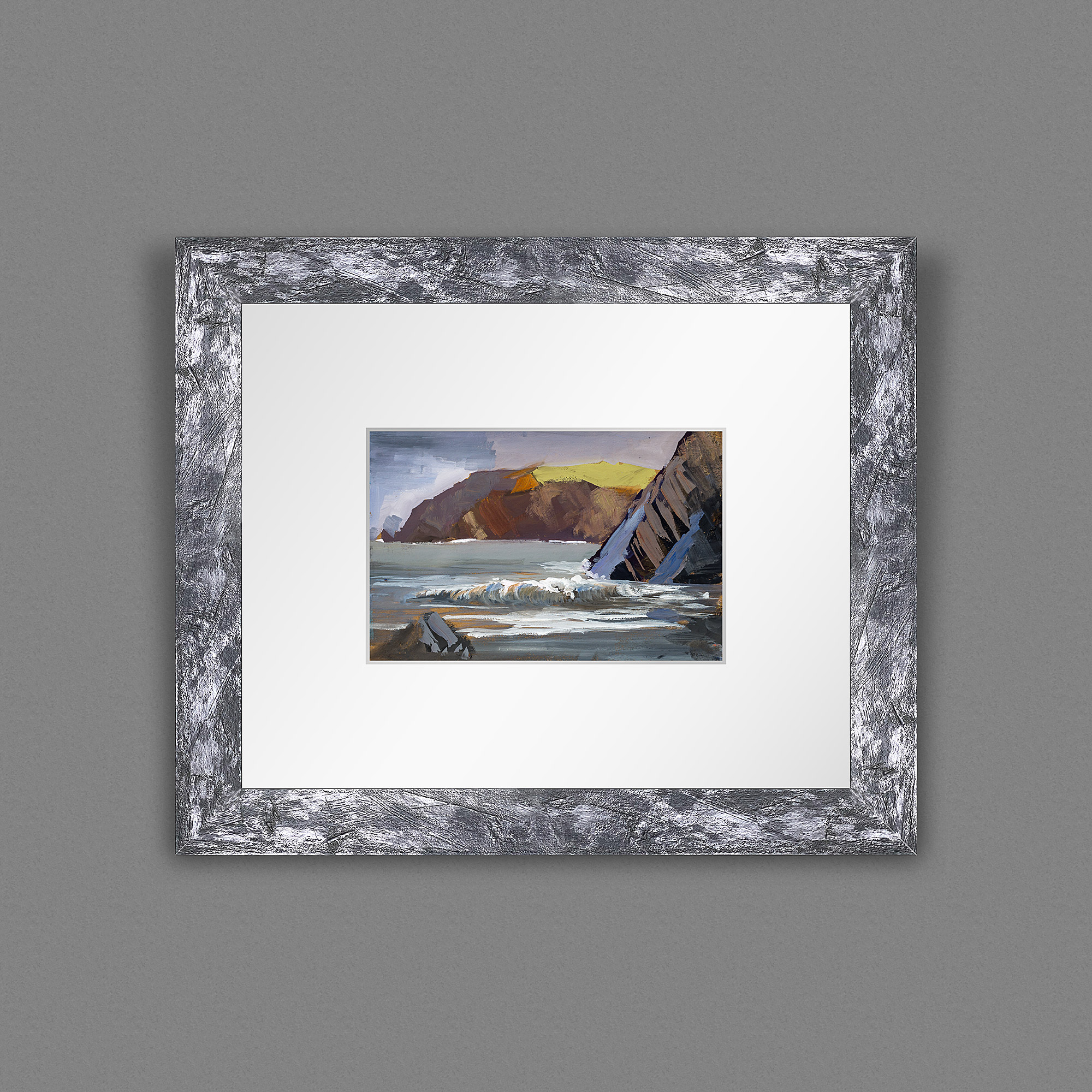 Lee Bay looking towards Ilfracombe, painted with a rich earthy palette. I finished the piece with bright white highlights to form the foaming waves rolling towards the shore.