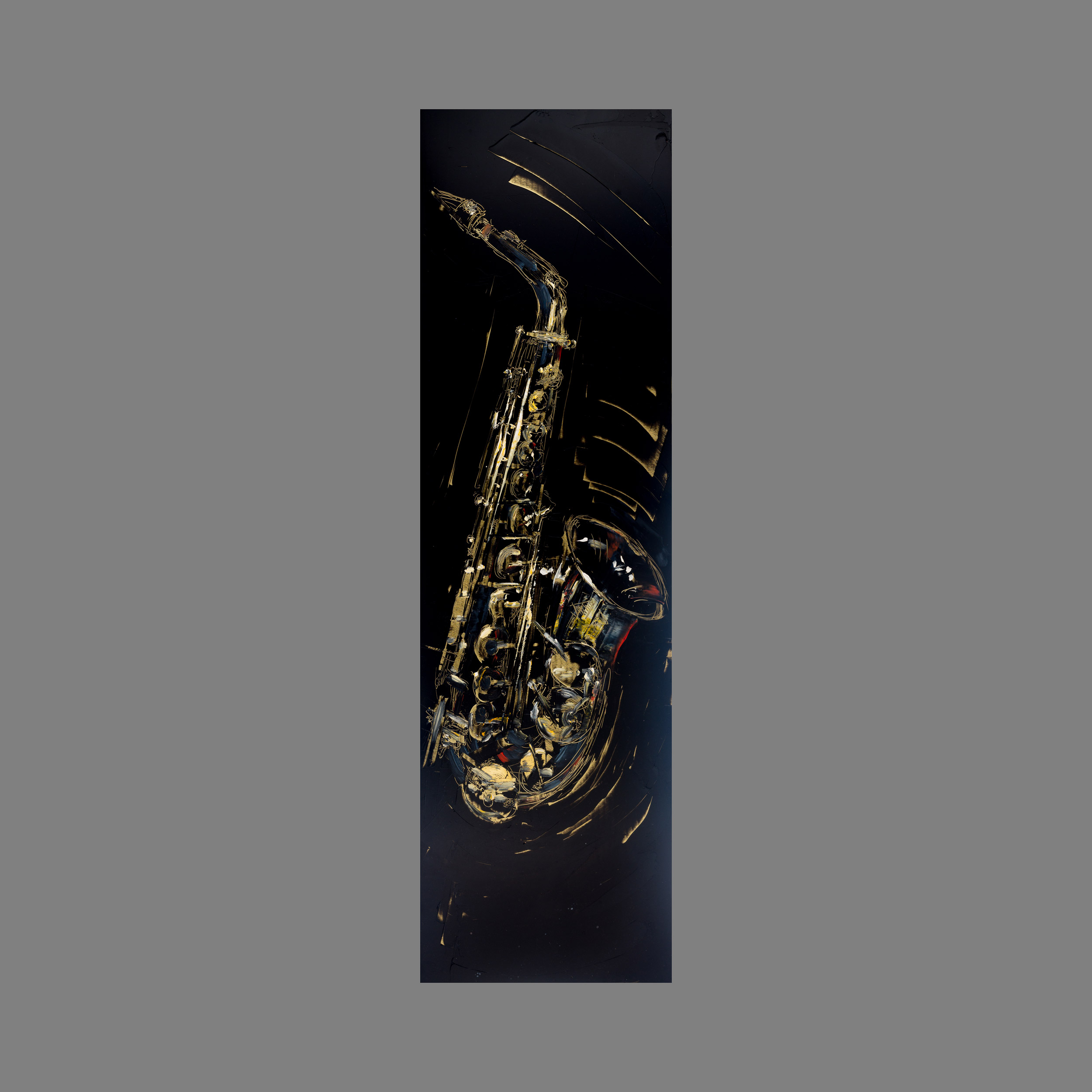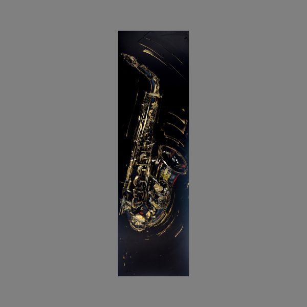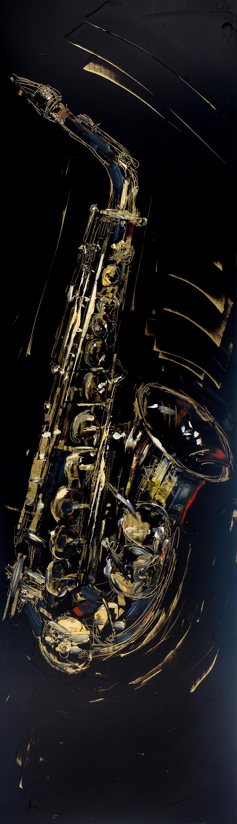 Over the last few years, I have been teaching myself how to play the saxophone, and it has become a major part of my life and art. I was told when I was sixteen that if I didn't learn how to play music then, there was no point in trying. It wasn't until recently that I realised how wrong that was. I can play a few tunes now, so it is never too late! Aside from feeling a sense of accomplishment, playing the saxophone and listening to Jazz whilst I paint inspires a rhythmic movement in my brushstrokes and encourages me to express my inner soul on the canvas. Painted onto brass, I wanted to experiment with scratching away at a layer of black paint to form shape of the saxophone. I then added detail and colour using oils.