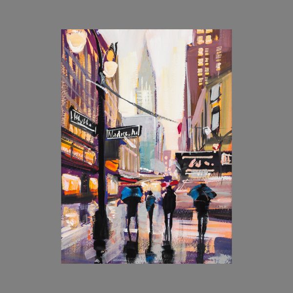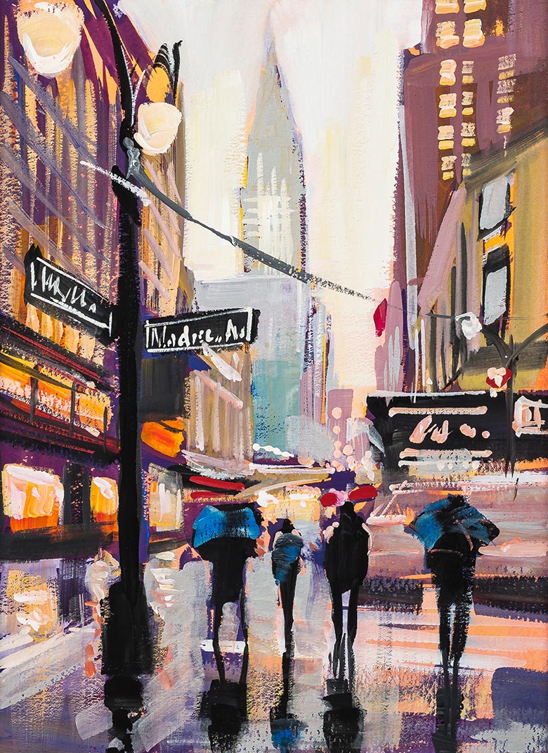 Pedestrians shelter from the rain under their umbrellas, as they approach the Chrysler Building. The rain adds an extra glow to the New York City streets.