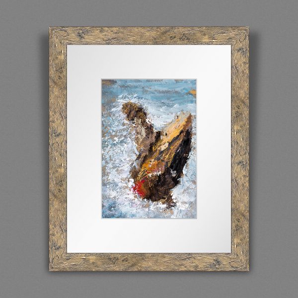 Looking down on the rock formations from Ilfracombe Lighthouse, this piece captures the unmatchable force and crashing movements of the sea with lashings of thick textural paint and quick rhythmic marks. Metallic paint portrays the glistening wet surface of the rocks reflecting the warm light.