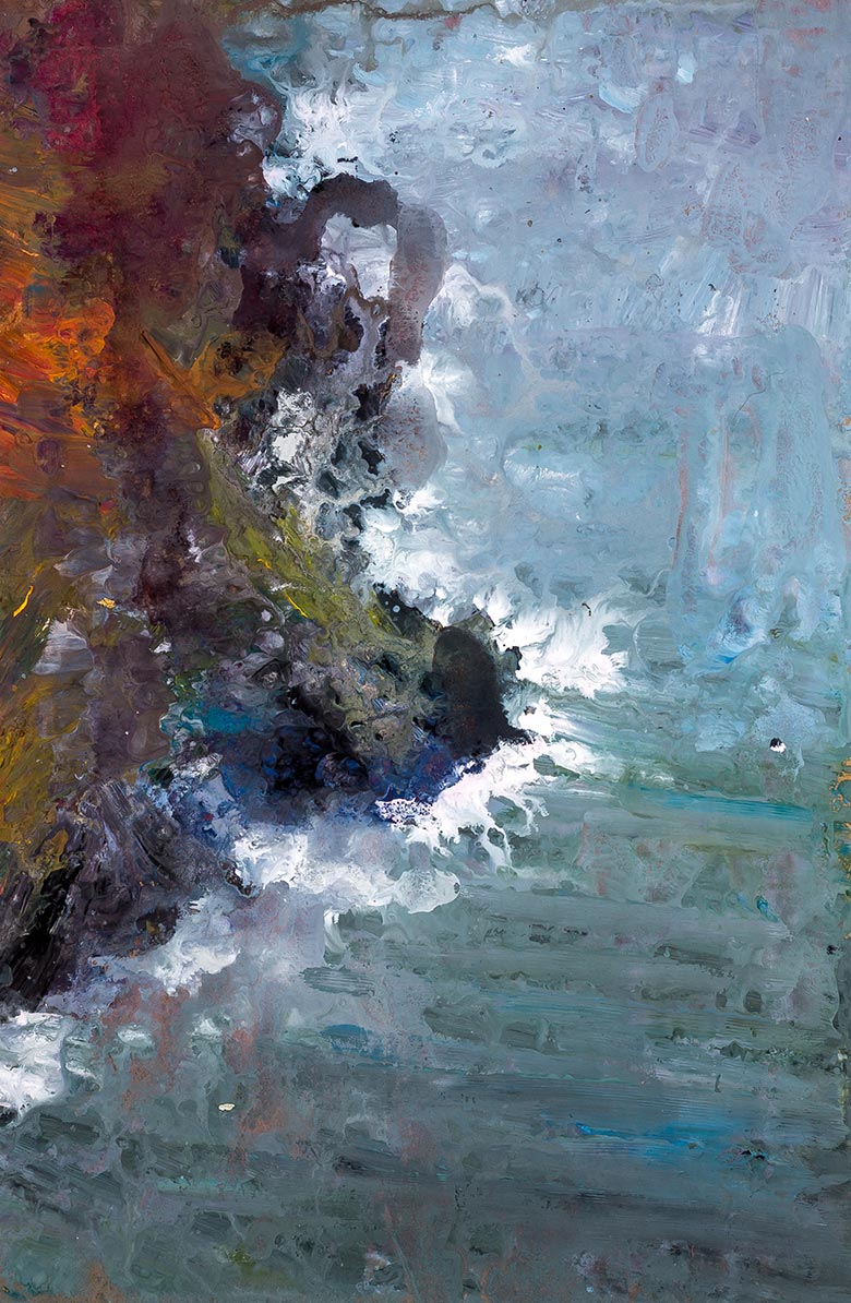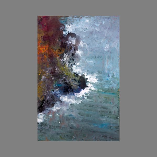 Working outdoors through all weather conditions is imperative to my practice, as it allows me to experience the true essence and dynamism of a place. I painted this piece whilst battling with the rain and wind on the North Devon coast, as the force of the sea was washing up against the rocks below me. Raindrops fell onto my sketchbook as I painted, causing the paint to pool and run down the page, which created a piece that organically embodies the vigorous movement of the scene. Nothing beats the feeling of being at one with the landscape, and I love working collaboratively with nature to recreate this feeling in my artwork.