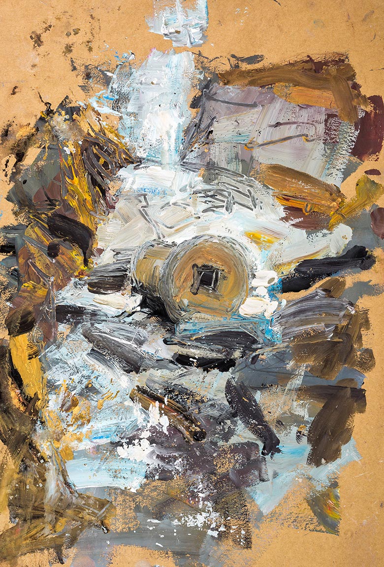 Making sure there would be no exception to my 'paint every day' mantra needed to complete the project, I made sure I found time to get this quick painting whilst walking with my family on Christmas Day, along one of my local beaches. I came across this interesting concrete stone with a hole in the middle. The cylindrical form gives a focal point to this abstract explosion of energetic paint splashes and scored lines.