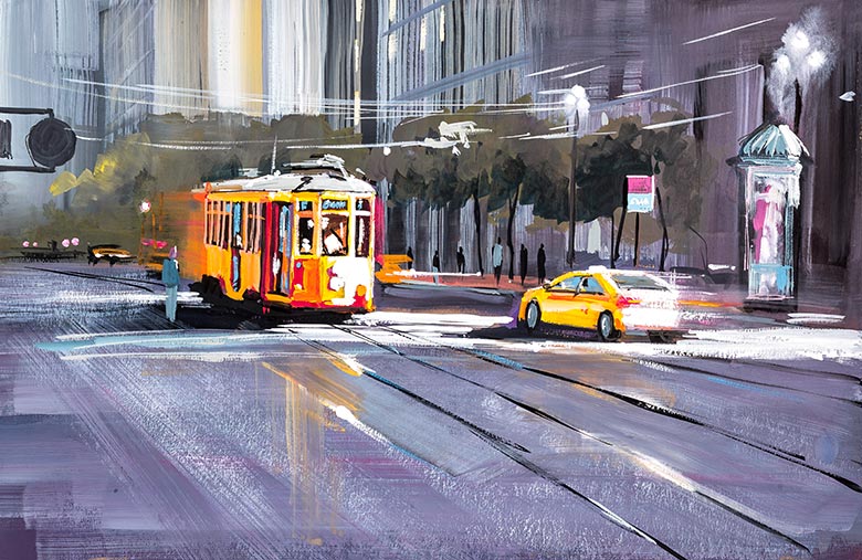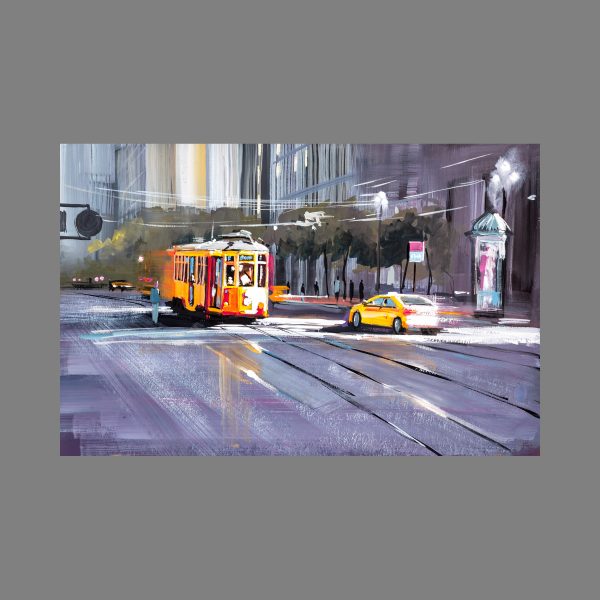 There always has to be a focal point within a painting, whether that be a shaft of light, a movement or a unique detail. Whenever I am creating a new piece, I think about what might engage and speak to the viewer. What makes this piece interesting to me is the shaft of light hitting the warm hues of the tram and taxi, contrasting perfectly against the greys of the tarmac and buildings. Subtle sparkles of light are reflected on the tram lines, giving this piece a wonderful luminosity throughout.