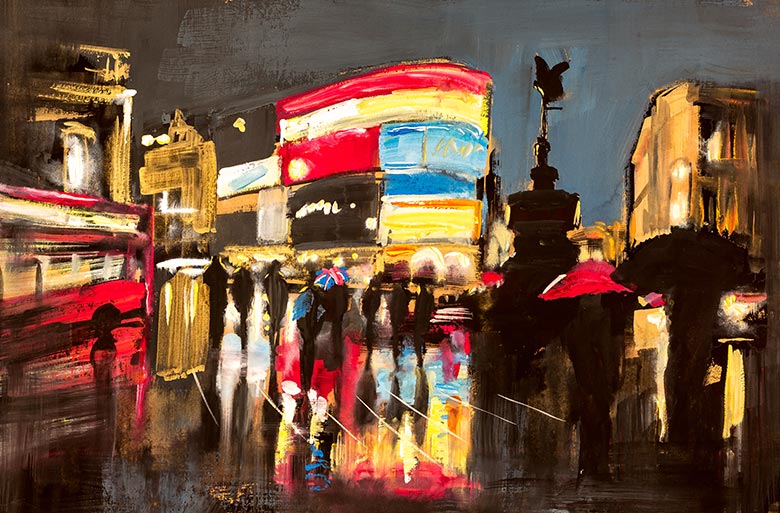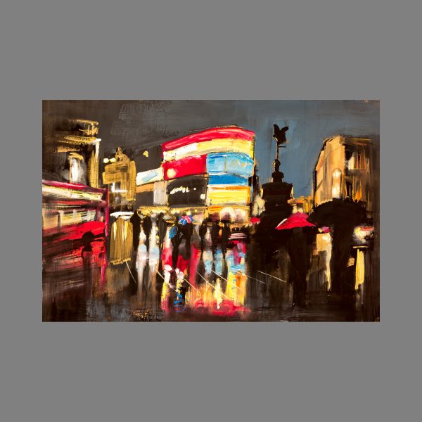 The ever-bustling Piccadilly Circus, with its bright flashing lights illuminating the streets, as a red London bus rushes past towards Regent Street.