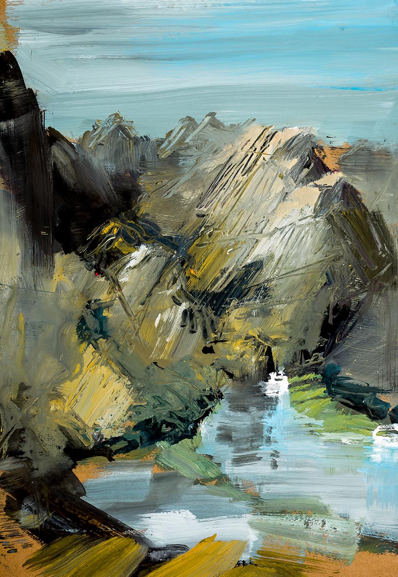 The diverse textures of rocky Lee Bay are painted with thick gestural brushmarks, dripping washes of paint and scored lines with the end of a paintbrush.