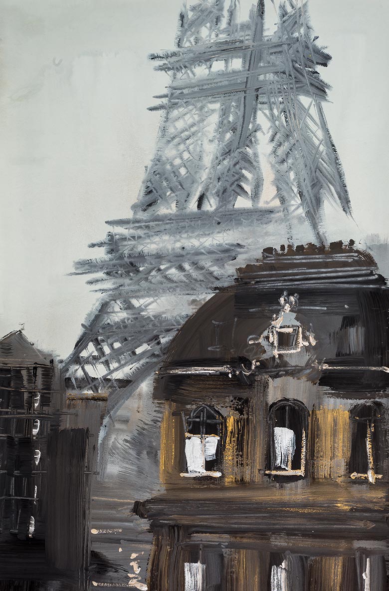 To create this atmospheric and misty Eiffel Tower scene, I used a wet-on-wet technique to feather and dissipate the paint softly. I also incorporated metallic paints to give a glimmering surface, as if it has just rained.