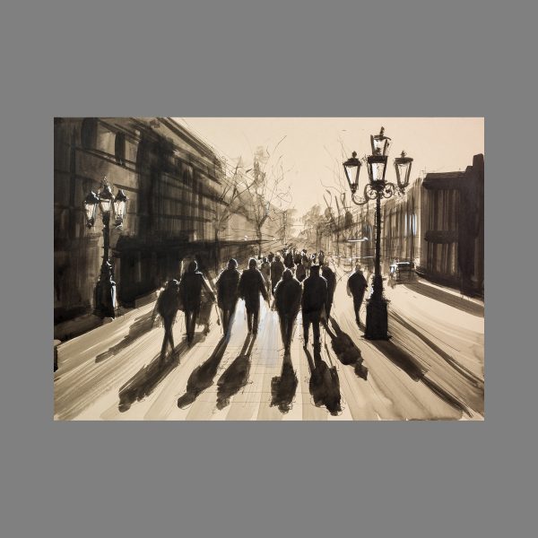 On this morning wandering the streets of Barcelona, I was mesmerised by the shadows of pedestrians stretching out on the pavement before me. The light created strong contrasts between light and dark, perfect for a tonal study in pen and ink.