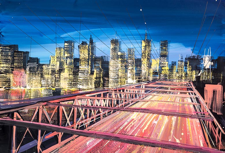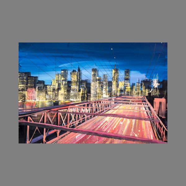 The illuminated high-rises of Manhattan, viewed from Brooklyn Bridge.