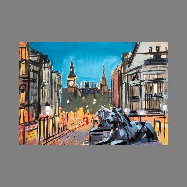 Warm light emanating from London's Trafalgar Square at night, painted with ink and gouache, and then finished with splatters of paint to suggest the rush of traffic and people.