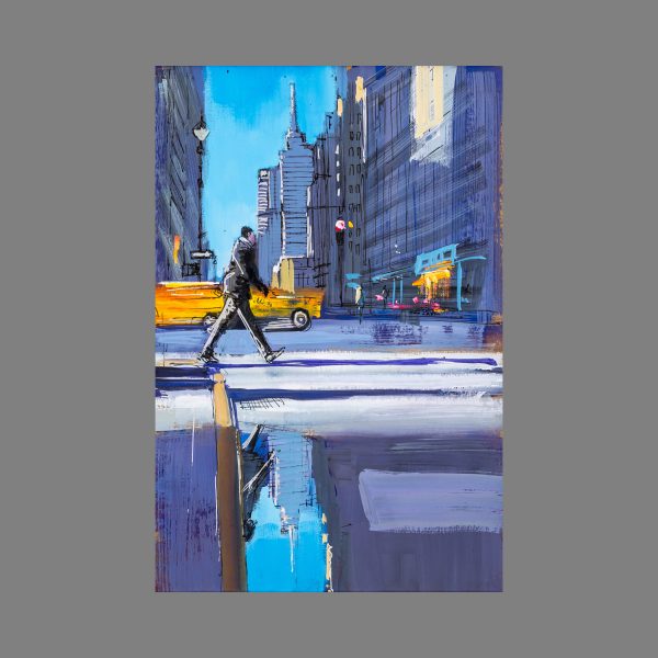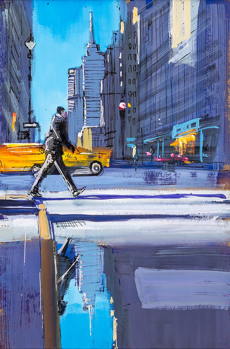 The light was fantastic when I took this picture, as the sun was casting a bouncing yellow light across the city, making the dramatic shadows cast appear a striking purple hue. I always look for the colour within shadows, as no shadow is ever completely black. I was drawn to the stillness of the puddle in the foreground which gave an almost mirrored effect, just catching the man as he strode briskly across the busy New York street. I painted with a variety of brushes and marks to reflect the many textures of the city's surfaces.