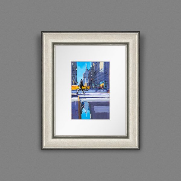The light was fantastic when I took this picture, as the sun was casting a bouncing yellow light across the city, making the dramatic shadows cast appear a striking purple hue. I always look for the colour within shadows, as no shadow is ever completely black. I was drawn to the stillness of the puddle in the foreground which gave an almost mirrored effect, just catching the man as he strode briskly across the busy New York street. I painted with a variety of brushes and marks to reflect the many textures of the city's surfaces.