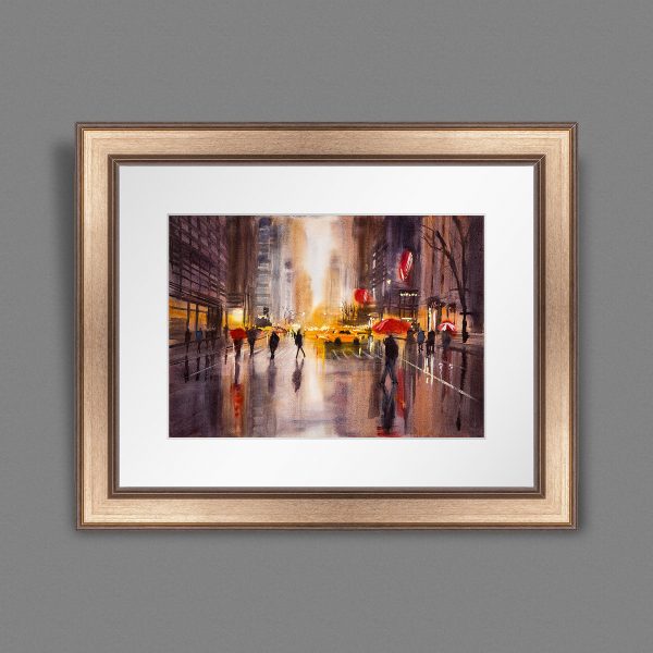 A wet New York street scene, with reflected city lights, and pedestrians rushing to shelter from the rain.