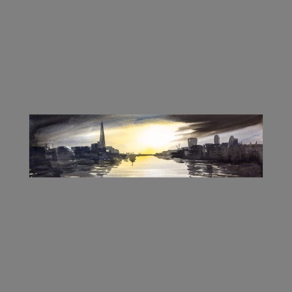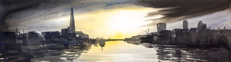 A tonal study of the London skyline and reflections on the Thames with watercolour and ink. Watercolour and ink are a great combination, as watercolours provide a wash of colour, whilst ink allows for dark contrasts - perfect for a silhouetted skyline.