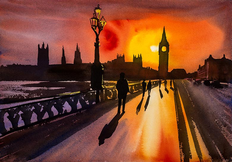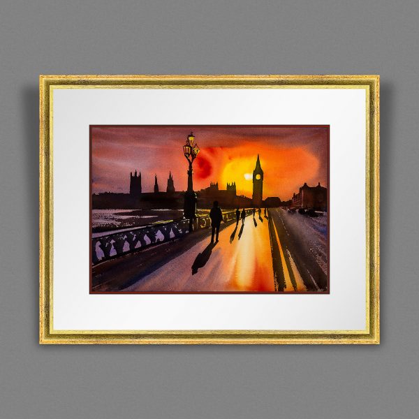 The Palace of Westminster from Westminster Bridge, silhouetted against rich sunset skies.