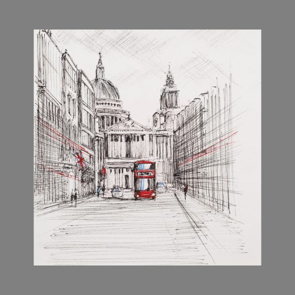 An instantly recognisable London scene, with a red London bus, British flags, and of course, the magnificent St Paul's Cathedral.