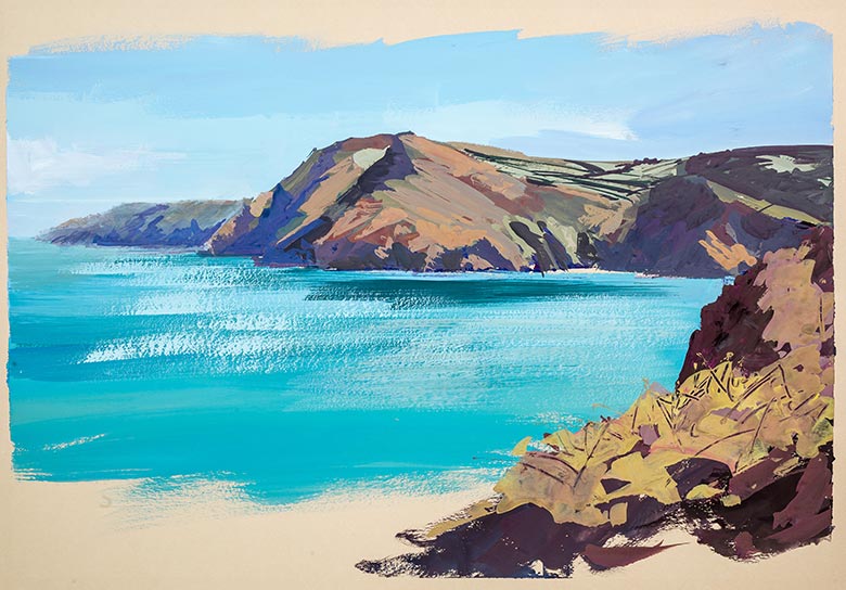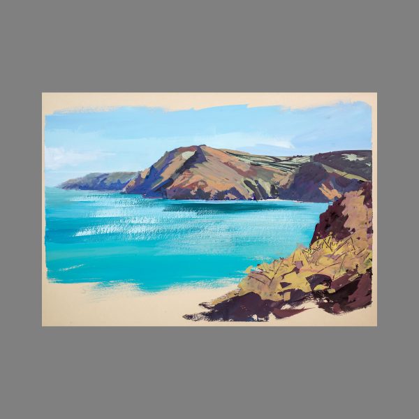 I painted this piece from above Watersmouth in North Devon, looking down towards Combe Martin, a natural cove which is used as a harbour offering refuge from rough seas. On this day, the sun beamed down, bathing the scene in light and intensifying the vibrancy of colours. I chose to paint with gouache as it is the perfect medium for creating highly pigmented blocks of colour, allowing me to capture the lush greens of the headland and the blues of the sea and sky.