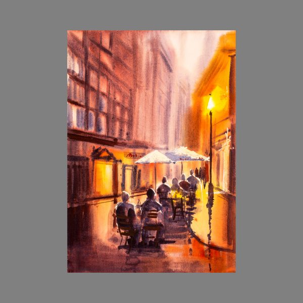When painting a cafe scene, I like to use the lights radiating from inside and from the surrounding street to enhance the mood, and form an interesting part of the composition. To me, there is something so calming about a cafe scene, as it reminds me of that quiet moment you have to sip a cappuccino or a glass of wine, whilst watching the world go by.