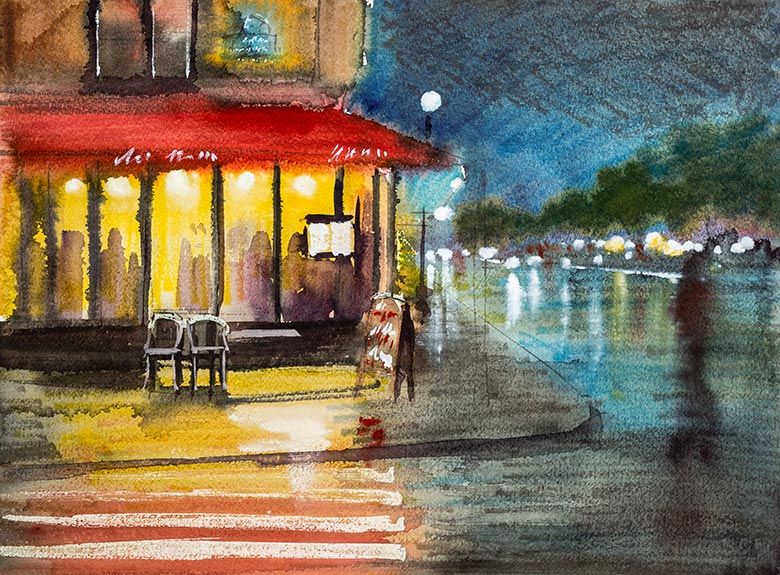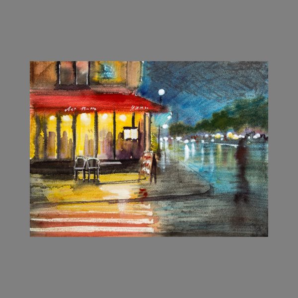 An evening view of a Parisian cafe, emanating a warm glow amongst the darkness.