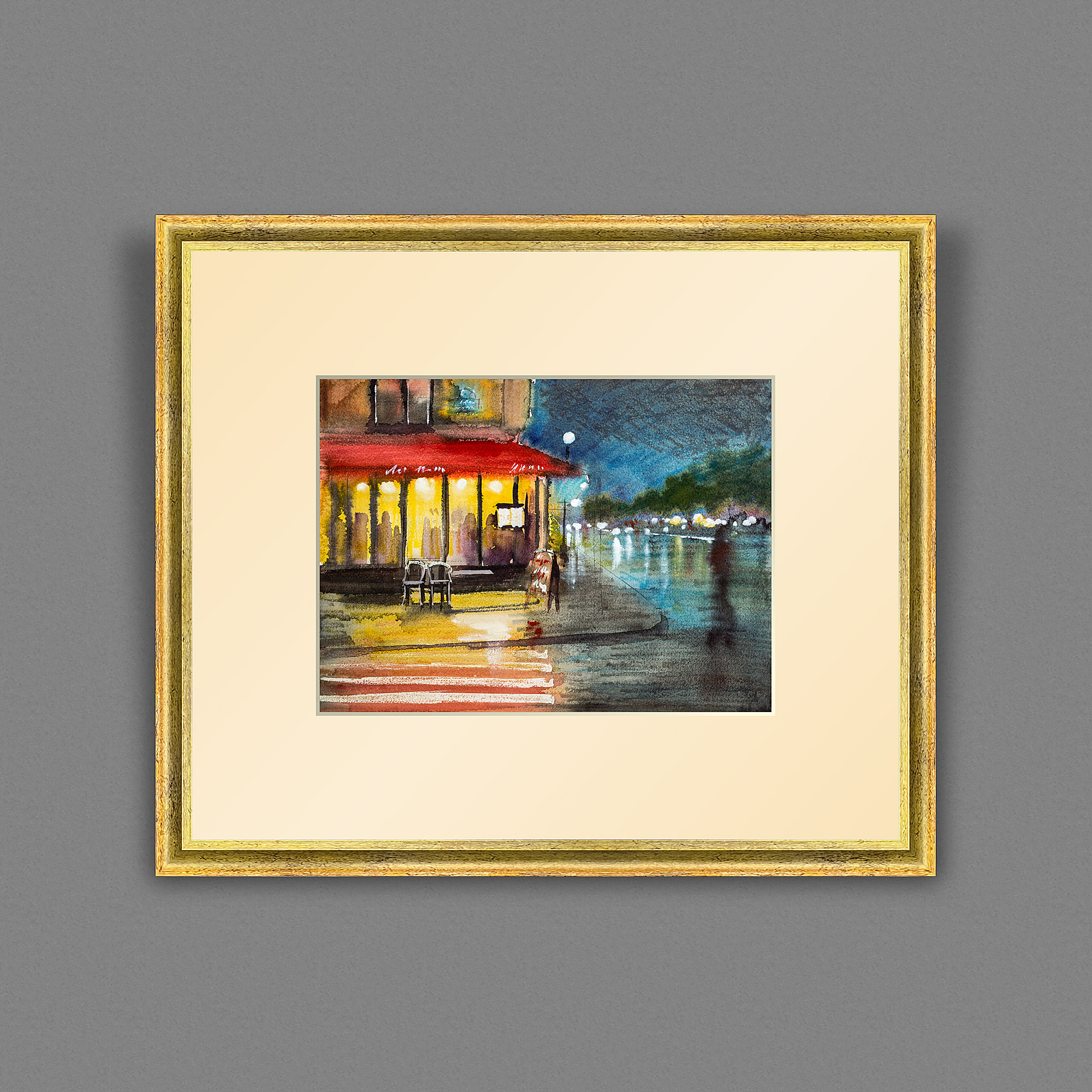 An evening view of a Parisian cafe, emanating a warm glow amongst the darkness.