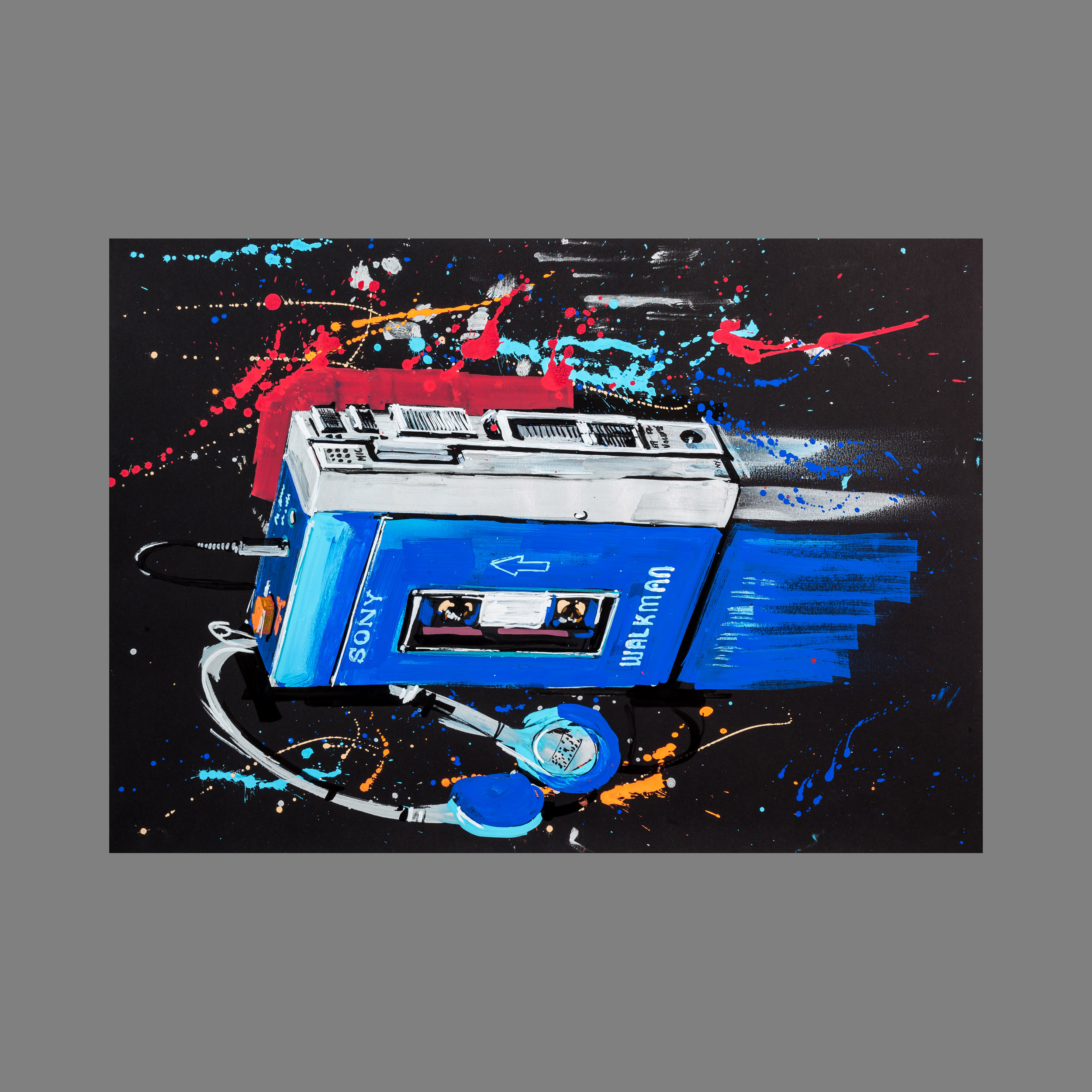 I was recently inspired to paint retro objects after re-discovering some of my old gadgets from the 80s. Seeing and holding my walkman again, I was reminded of the satisfaction of sliding a cassette into the player and hearing the whir as the tape begins to play. I wanted to recreate the joyous feeling of listening to music on my walkman, so I used posca pens to create vibrant splashes of paint, somewhat reminiscent of musical notes.