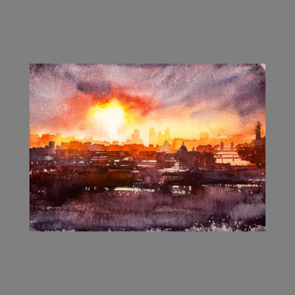 Looking out towards the distant depths of the city, London's iconic skyscrapers rise faintly through the sunset haze.