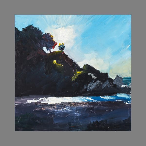In this painting of Lee Bay, the sun is rising behind the trees, creating a crisp contrast between light and dark. The edges of the shadowed rocks appeared sharp and angular against the piercing sun, so I painted these with rich black paint to capture these distinct shapes. Light glistened and sparkled on the water, reminding me how magical the bay can feel at sunrise.