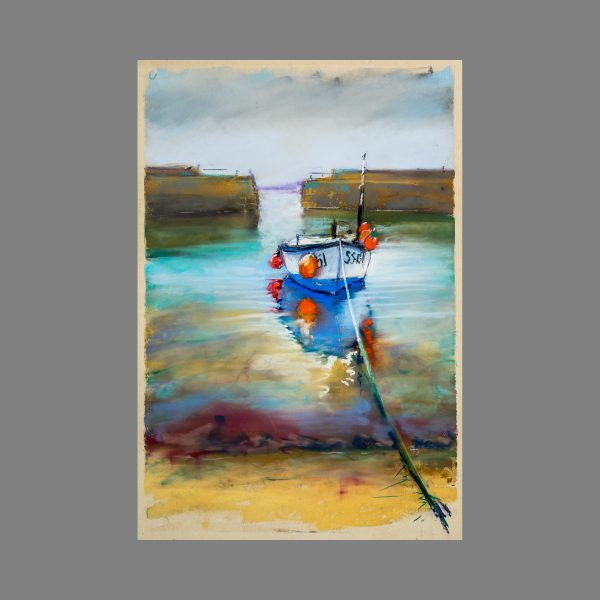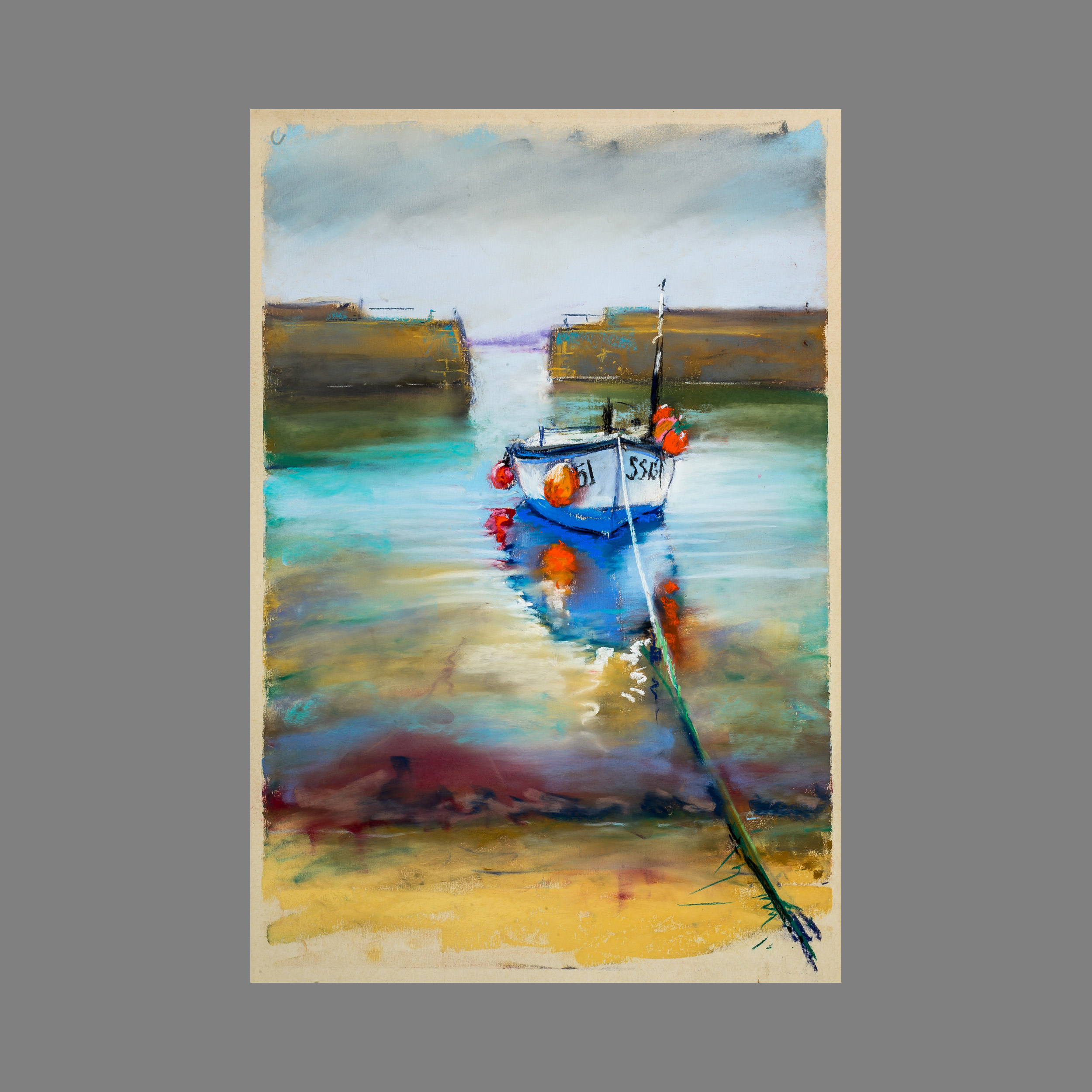 In this pastel drawing of a boat in Mousehole Harbour in Cornwall, my main concern was with capturing the strong reflection of the boat on the water. When creating reflections, the level of mirror finish is dictated by the turbulence of the water's surface. As this is an inlet of the harbour, the water was very still with just a few ripples, so it gave the perfect conditions for painting a really complementary reflection.