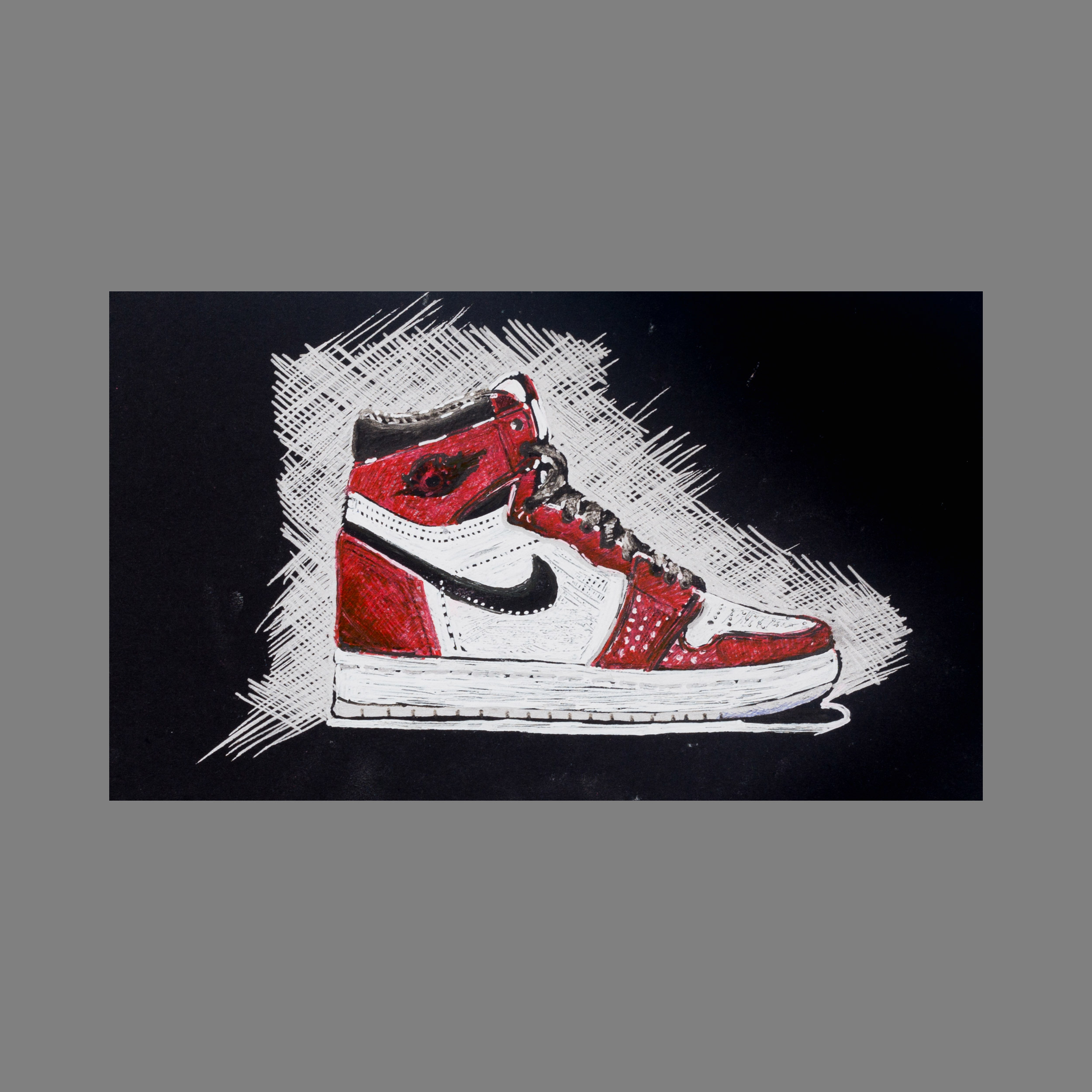 Alongside painting cityscapes, I like creating art that reflects on certain times in my life - for instance, growing up in the eighties and the symbols that defined 1980s pop-culture. The Nike Air Jordan I basketball sneaker produced in 1984 for Michael Jordan was iconic, and went on to dominate the shoe market at the time. I really admired how these sneakers broke tradition, as the first multi-coloured shoe to be worn in the NBA, despite being banned. To create this piece, I used gel pens to capture the sneaker's simple silhouette, block colours, and stitched leather details.