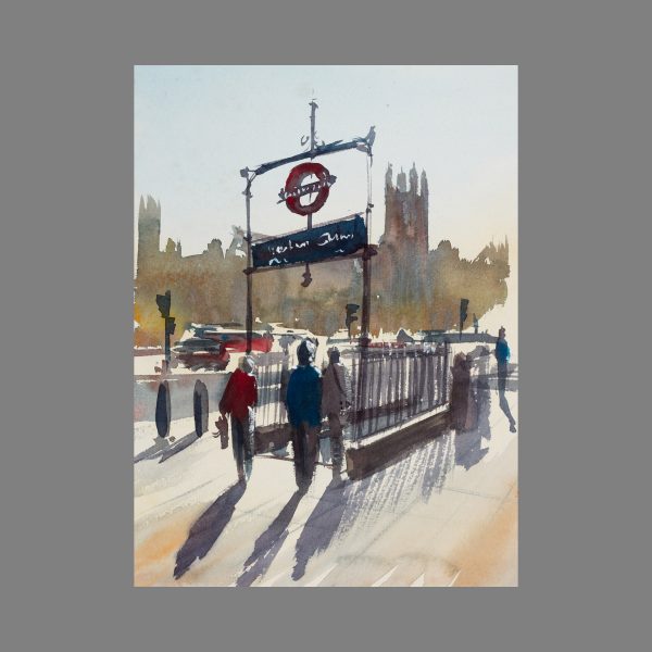 With light washes of transparent paint, I captured this bright Westminster evening scene. Instead of painting minute details, I focused on the strong shadows cast by the low setting sun, helping to portray the atmosphere of the scene.