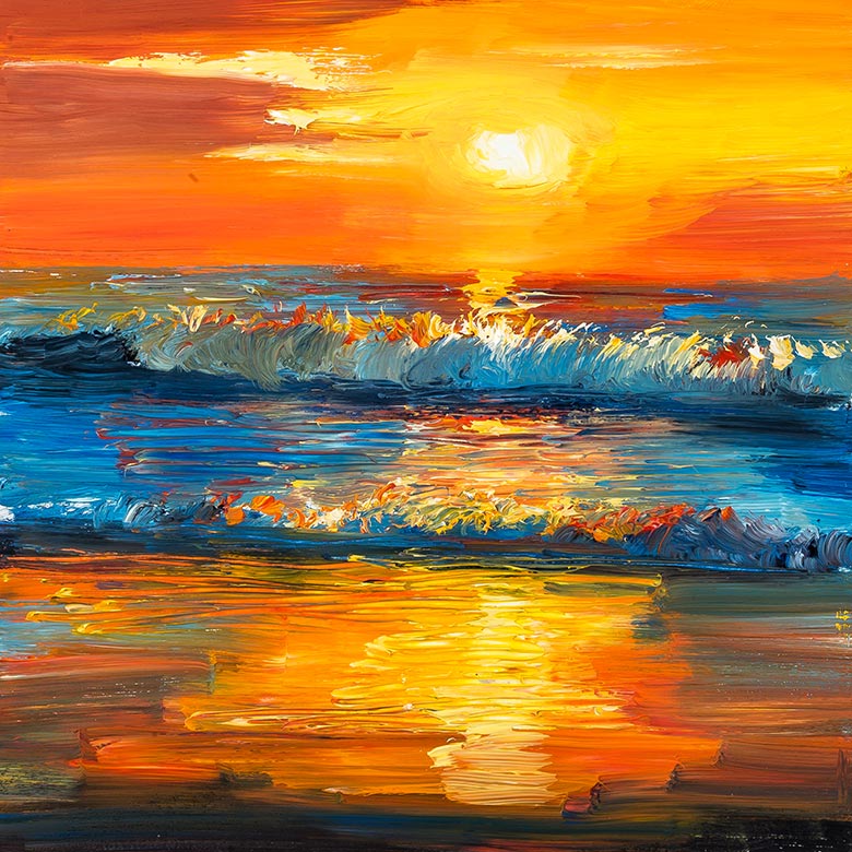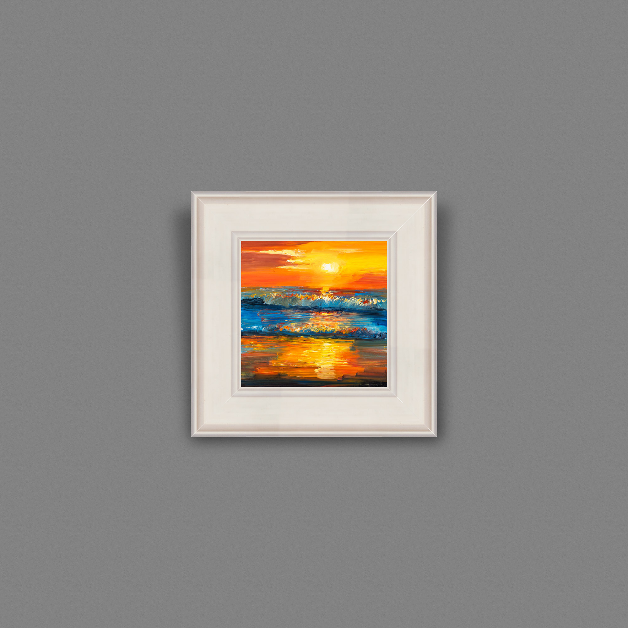 Painted from sketches done on location in Costa Rica, I recreate a spectacular sunset that is forever burnt into my memory. Sunlight was thrown dramatically across the sea, lighting up the tips of the rolling waves brilliant shades of yellow and orange.