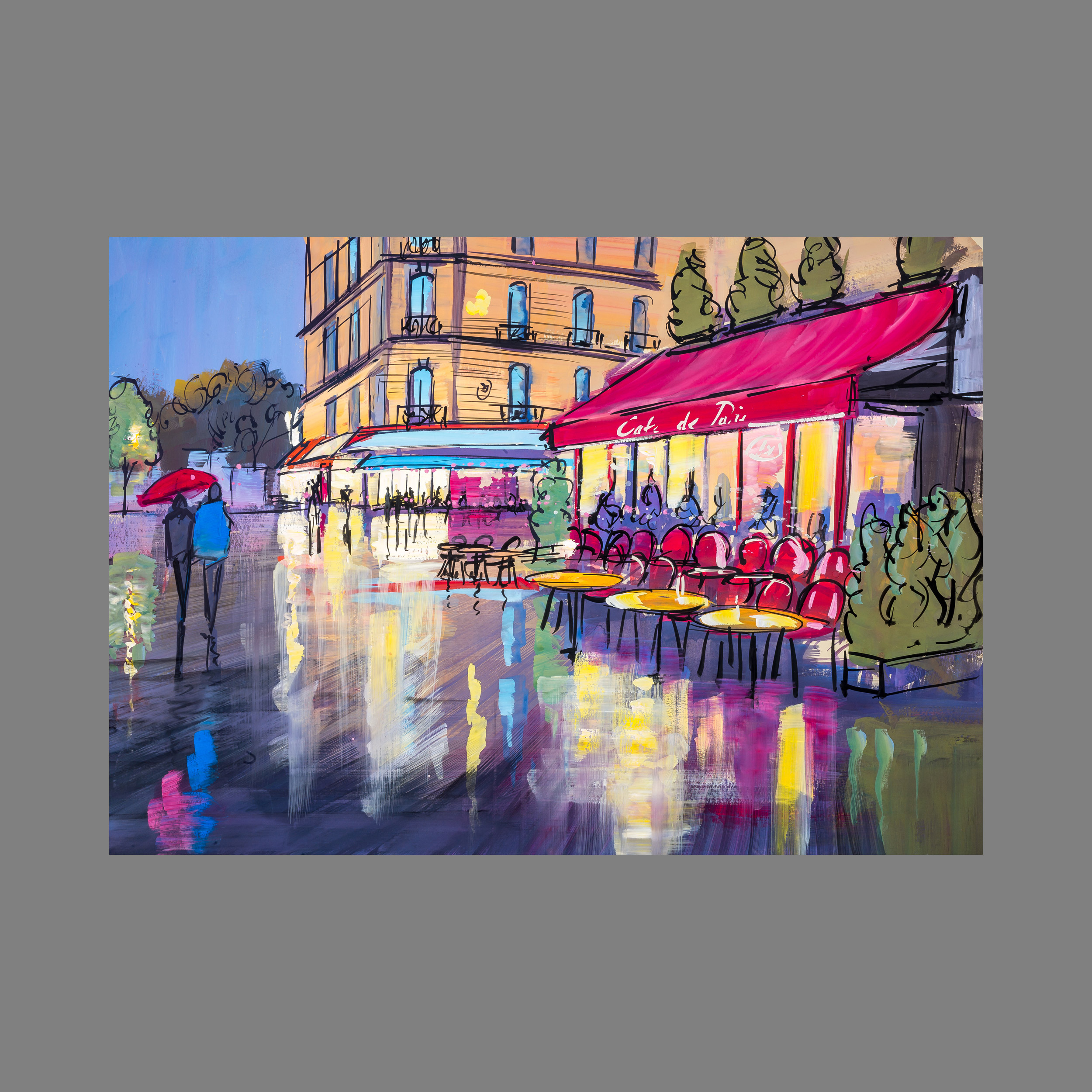 I love painting city scenes after rainfall, as when the sun illuminates the wet pavements the colours often appear more vibrant and vivid. On this Parisian street, streams of light emanate an inviting warmth from the shelter of the cafes. Cafes have long been the heart of social life in Paris, and a source of inspiration for many artists throughout history. I visit as many as I can whenever I am in Paris, to soak up the atmosphere and to observe people deep in conversation around me, bringing me closer to what great painters of cafe scenes such as Edouard Manet may have experienced in the 19th Century.