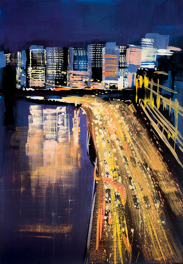 Brooklyn Bridge viewed from Manhattan Bridge, as streams of glowing light trail behind rushing traffic.