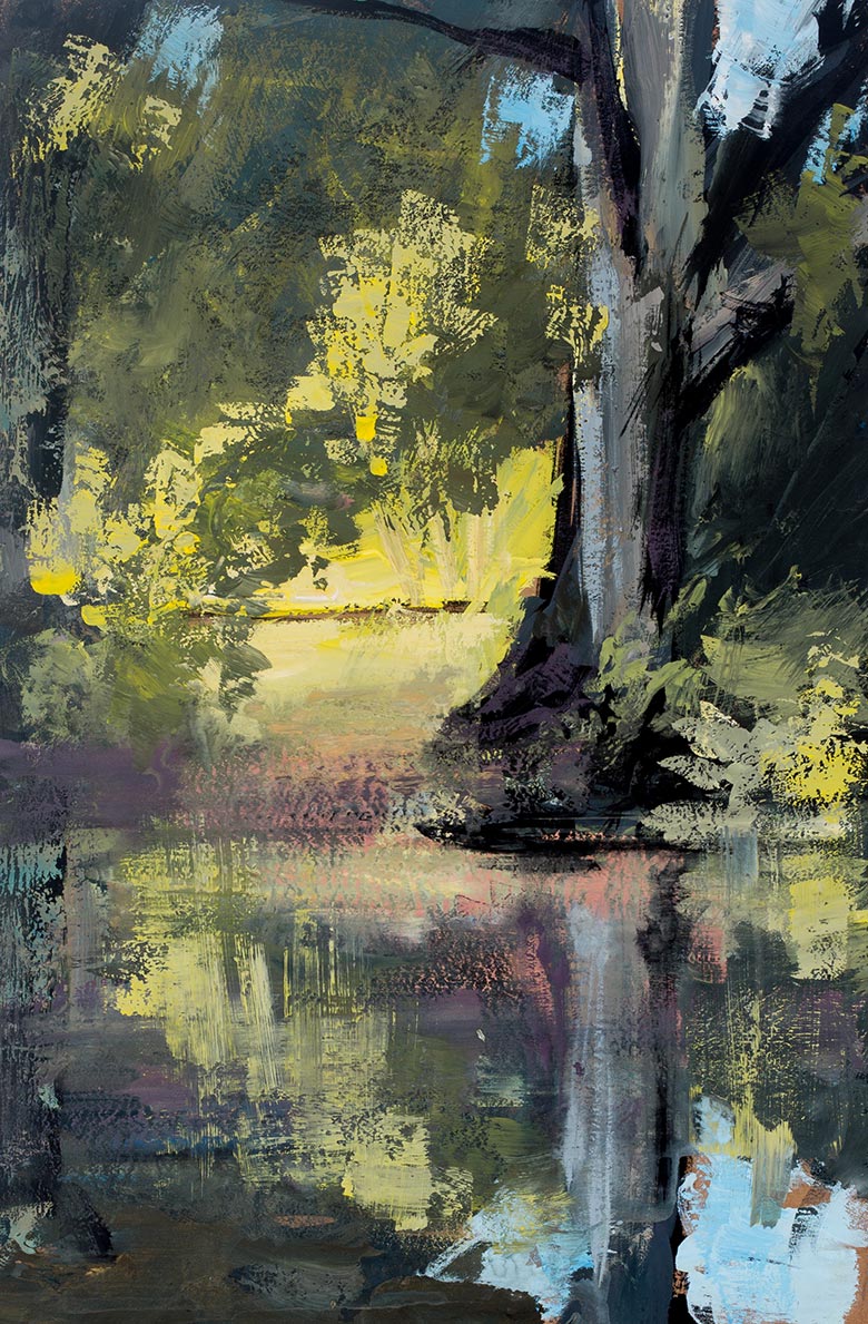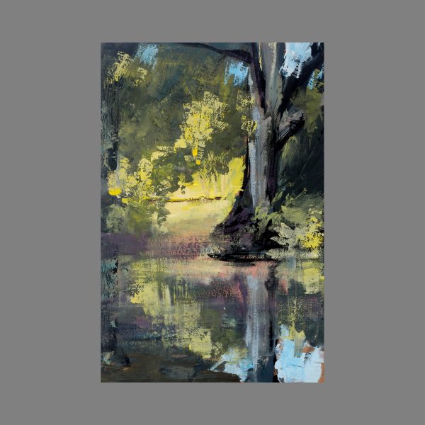 On the way to the alps for a few days of painting, I stopped off at a small stream running by a vineyard. On this bright August day, the light poured onto the tree, which reflected clearly onto the calmly moving water. This piece was painted using gouache, with only a little bit of water, to allow for a more textured surface and graduated paint marks.