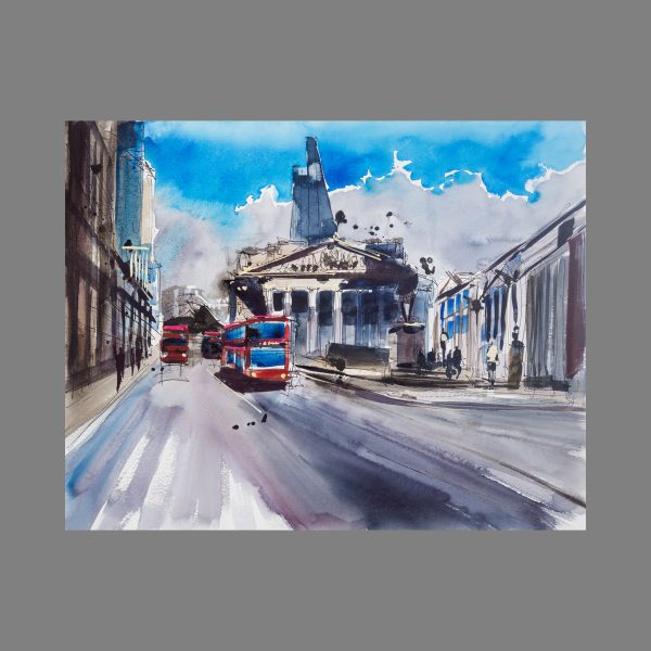 Every time I visit London's historic Royal Exchange, I recall my lively exhibition opening at Castle Galleries situated at the rear of the building, in which I regretfully arrived an hour late. With the event starting at 6pm, I strolled out of my hotel at 5pm, thinking that I would have plenty of time to get across the city, but how wrong was I! It soon became apparent whilst I was sardined into an overcrowded tube carriage that it would have been much quicker, and less stressful, to walk. When I eventually arrived, dizzy and close to collapsing, I was confronted by crowds of lovely people who had come to see my work. It felt incredible to have such a great turn out, but I needed to take a minute to gather myself before talking with the room full of visitors. On reflection, it was a pivotal moment of realisation that I was working myself to my limits and needed to better manage my time. This painting shows the Royal Exchange half in light and half in shadow from the clouds above, embodying my conflicting memories of this magnificent place.