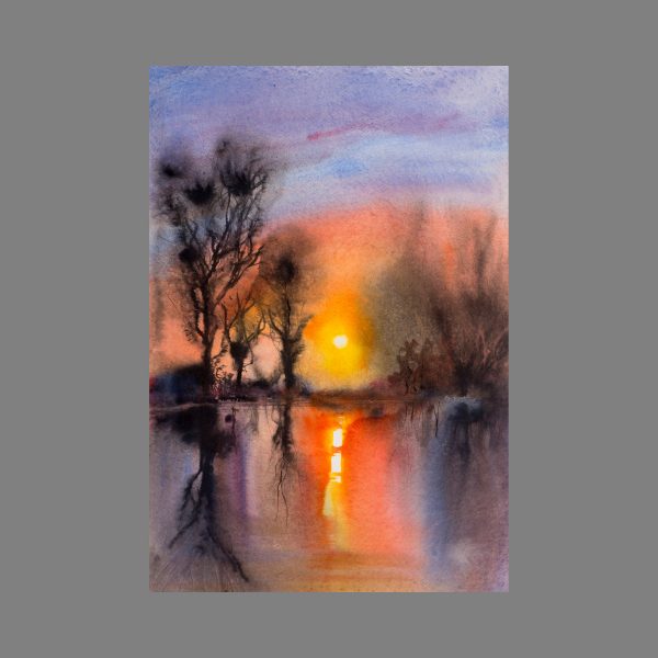 I used the fluid qualities of the watercolour and ink to my advantage to form this soft atmospheric riverbank scene. After doing an initial wash of watercolour, I added ink whilst the paper was still wet. The pigment of the black ink instantly split and spread on the page, appearing almost like the tree branches. It is really exciting to work with a wet-on-wet technique, as you never quite know what incidental marks will be created or how the paint will interact on the page.