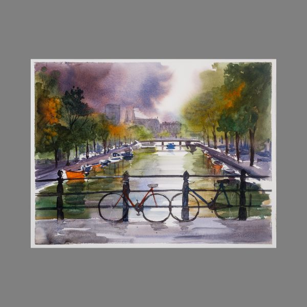 The view looking over one of Amsterdam's canals, just before the city is drenched with a heavy downpour.