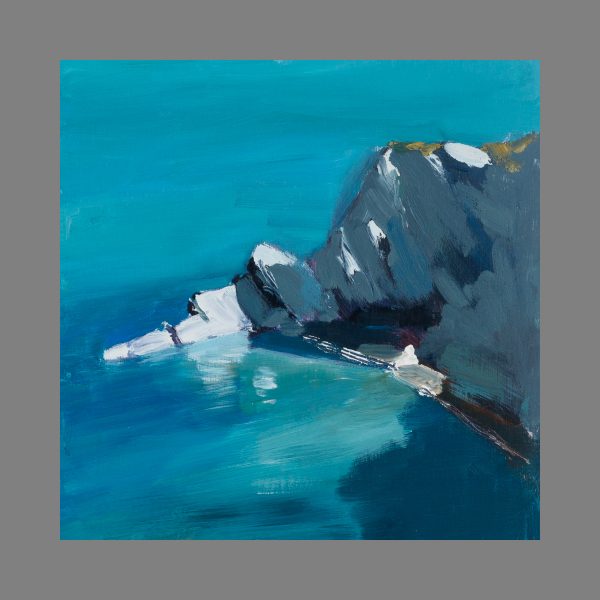 This is one of my favourite spots along the Tarka Trail in North Devon. This secluded beach is not possible to get to unless you are on a boat, so it is a really special location to paint. What I find beautiful about this untouched oasis is that as the afternoon sun hits the flat slate cliffs, the shining silver patina on the rocks is exposed. To create the diverse shades and textures of the rock, I mixed a variety of greys on my palette and layered them down with defined brushstrokes, finishing with a few highlights of glistening white.