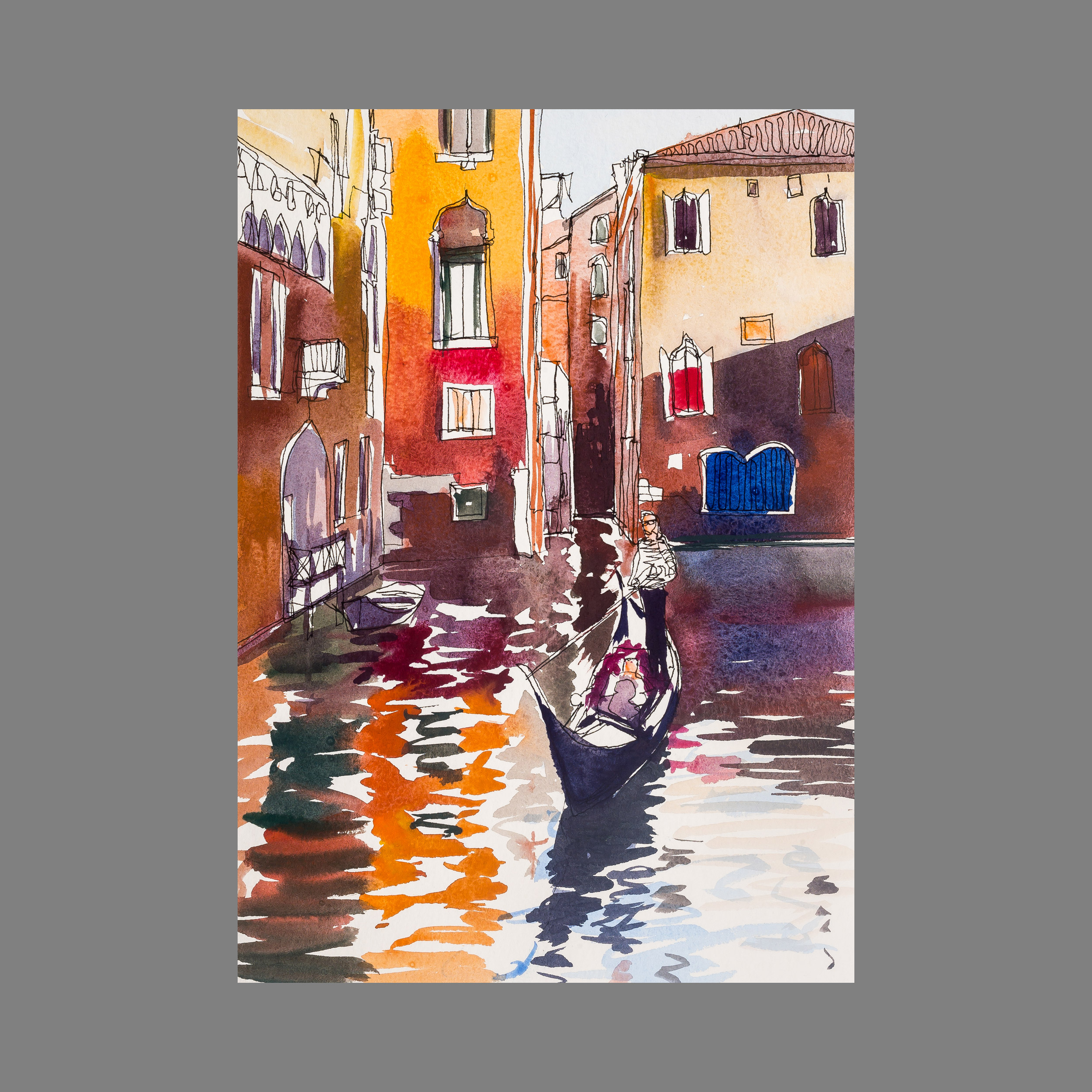 A colourful Venice scene, with a gondola floating along one of the city's canals.