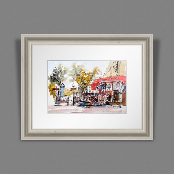 This lively Parisian cafe scene is captured with washes of watercolour and loose ink lines drawn with an ink stick.