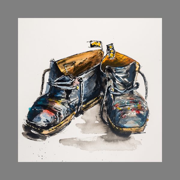 My trusty Dr. Martens painting shoes, this time painted in watercolour and ink on paper. After painting the shoes with a brush, I flicked paint onto the shoes to replicate paint splatters, and applied black ink with an old paintbrush handle which I had carved into a point. I go through brushes quite quickly, so it feels great to be able to recycle them into new tools and give them a new lease of life!
