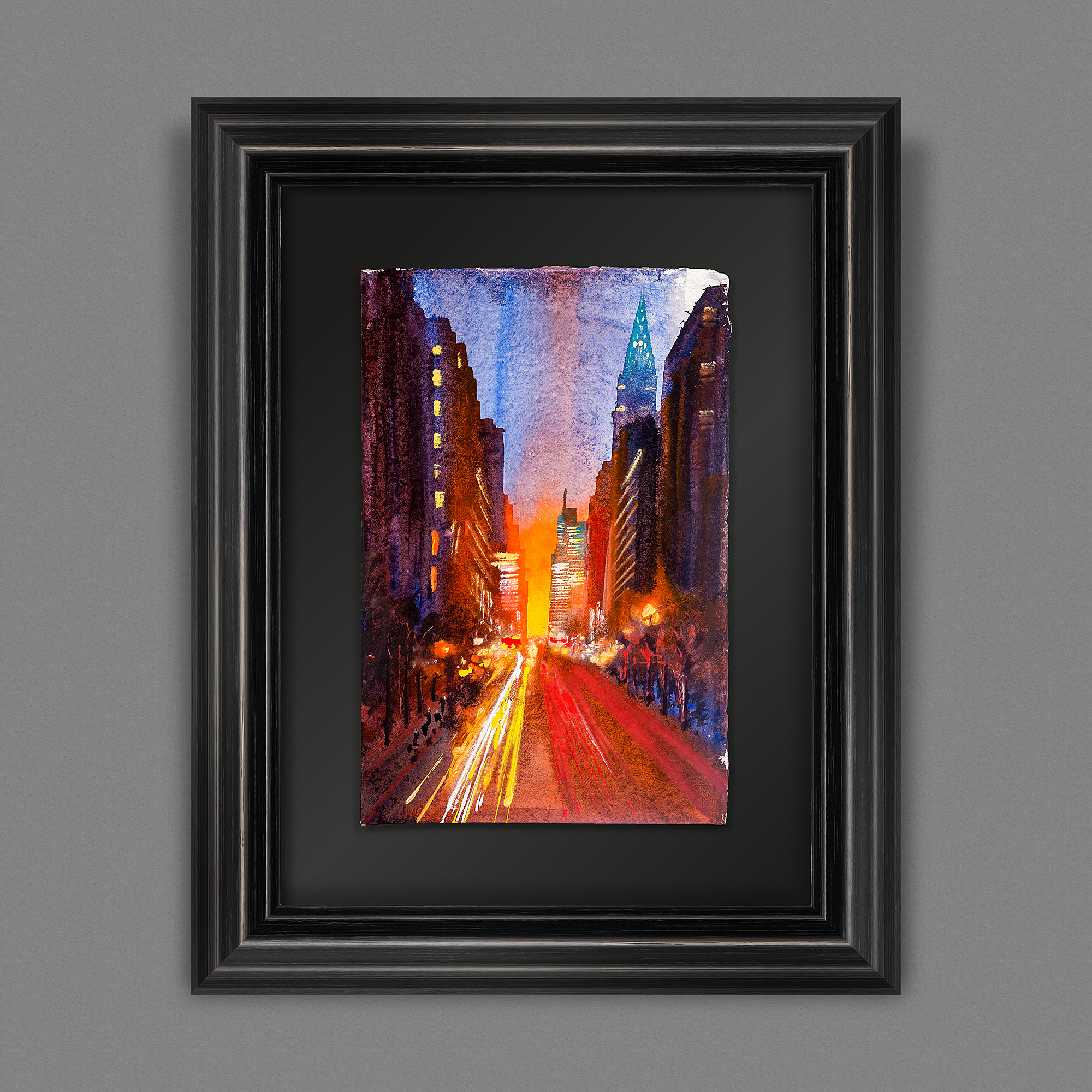 The Chrysler Building during a burning sunset, as lights from traffic trail on the streets below.