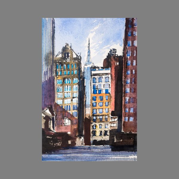 This slice of New York demonstrates the stylistic diversity of architecture packed within the city. The majestic Empire State Building stands out behind a crowd of buildings.