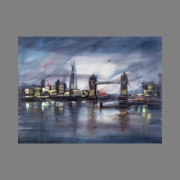 The London cityscape on a misty and atmospheric evening, painted with metallic paints for subtle shimmers of light.