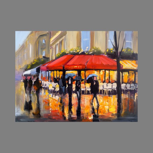 A classic Parisian scene with warm light emanating from the shelter of the cafe, painted with thick brush marks.